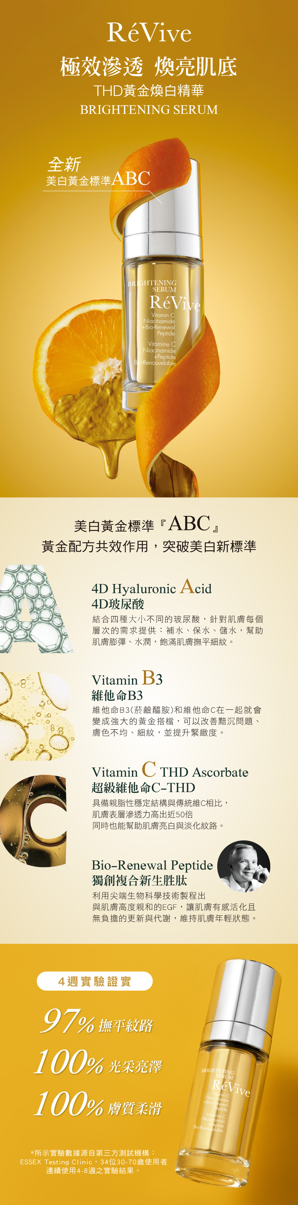 極效滲透 煥亮肌底!全新黃金標準ABC配方,突破美白新標準,滲透率更高更有感,綻放肌膚柔亮光澤。